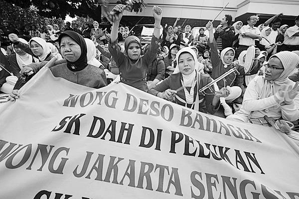 Para guru bantu sempat dihalang-halangi Satpol PP untuk masuk ke halaman DPRD Jakarta. Nyaris terjadi dorong-dorongan. Karena tak boleh masih ke gedung rakyat, para guru bantu hanya bisa duduk-duduk di depan pintu pintu gerbang.